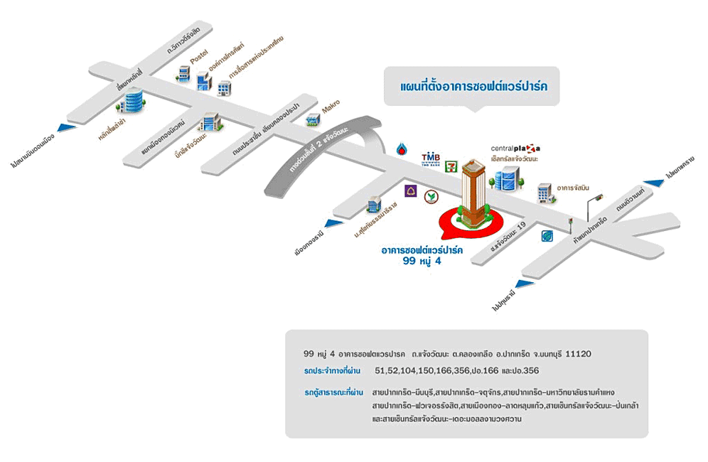 เลขที่ 99/18 อาคารซอฟต์แวร์ปาร์ค ชั้นที่ 18 หมู่ที่ 4 ถนนแจ้งวัฒนะ ตำบลคลองเกลือ อำเภอปากเกร็ด นนทบุรี 11120