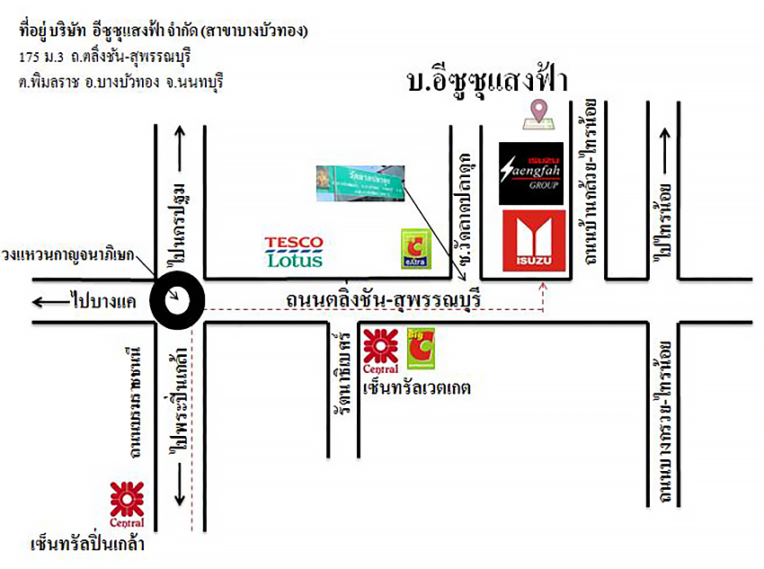 บริษัท อีซูซุแสงฟ้า จำกัด สาขาบางบัวทอง ( ฝ่ายบุคคล ชั้น 4 ) เลขที่ 175 หมู่ 3 ถ.ตลิ่งชั่น-สุพรรณบุรี ต.พิมลราช อ.บางบัวทอง จ.นนทบุรี 11110