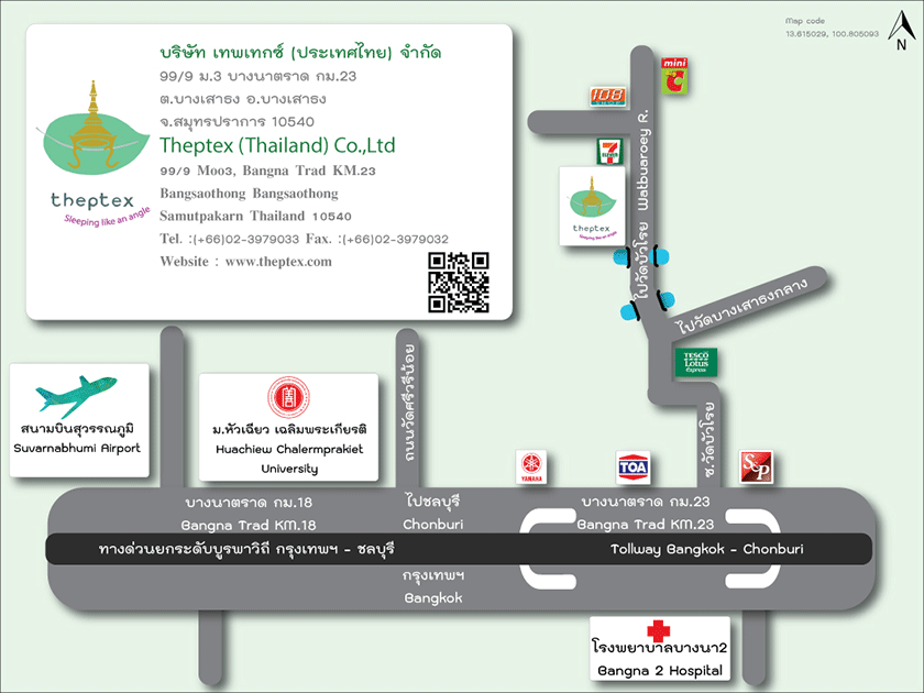 บริษัท เทพเทกซ์ (ประเทศไทย) จำกัด ถนนบางนา-ตราด กม.23 เลขที่ 99/9 หมู่ 3 ตำบลบางเสาธง อำเภอบางเสาธง จังหวัดสมุทรปราการ