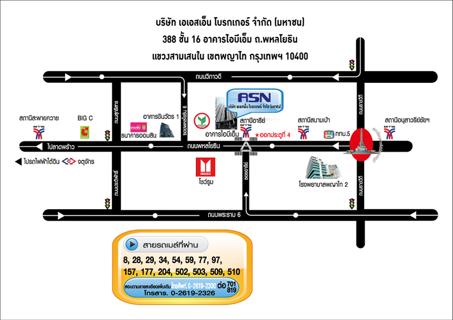 - บริษัท เอเอสเอ็น โบรกเกอร์ จำกัด (มหาชน) เลขที่ 388 อาคาร IBM ชั้น16 ถนนพหลโยธิน แขวงสามเสนใน เขตพญาไท กรุงเทพฯ 10400